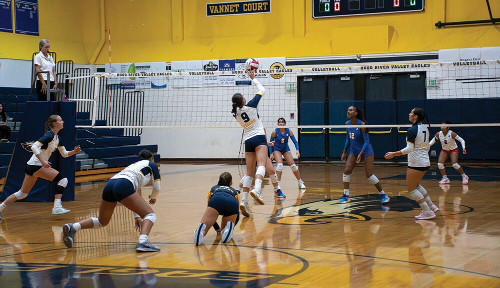 HRV’s Eleanor Buser (9) knocks the ball over the net in a match earlier this year